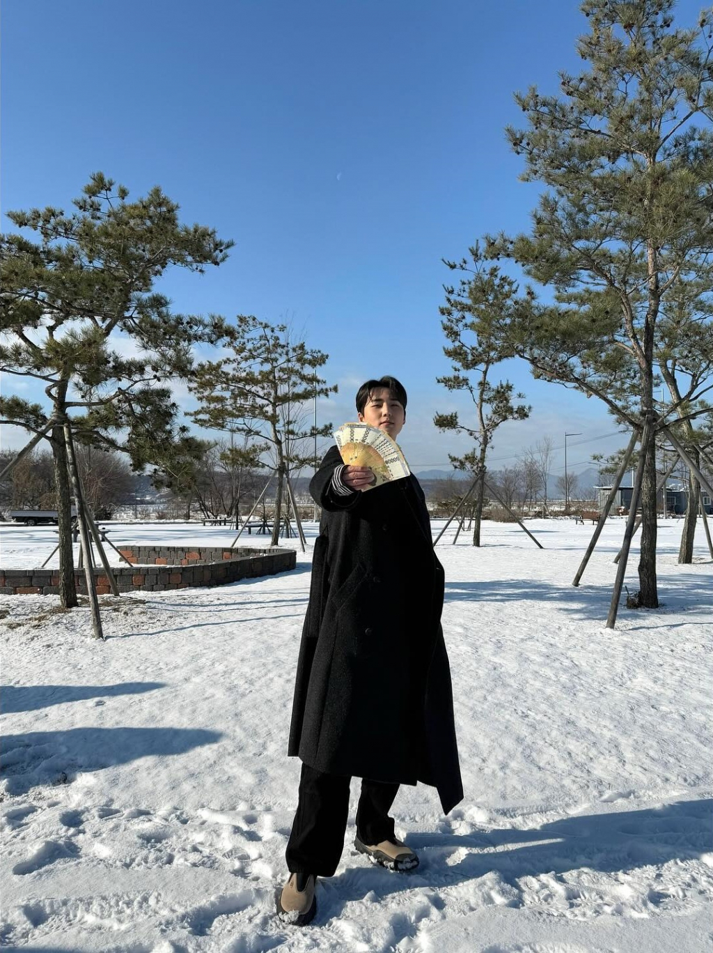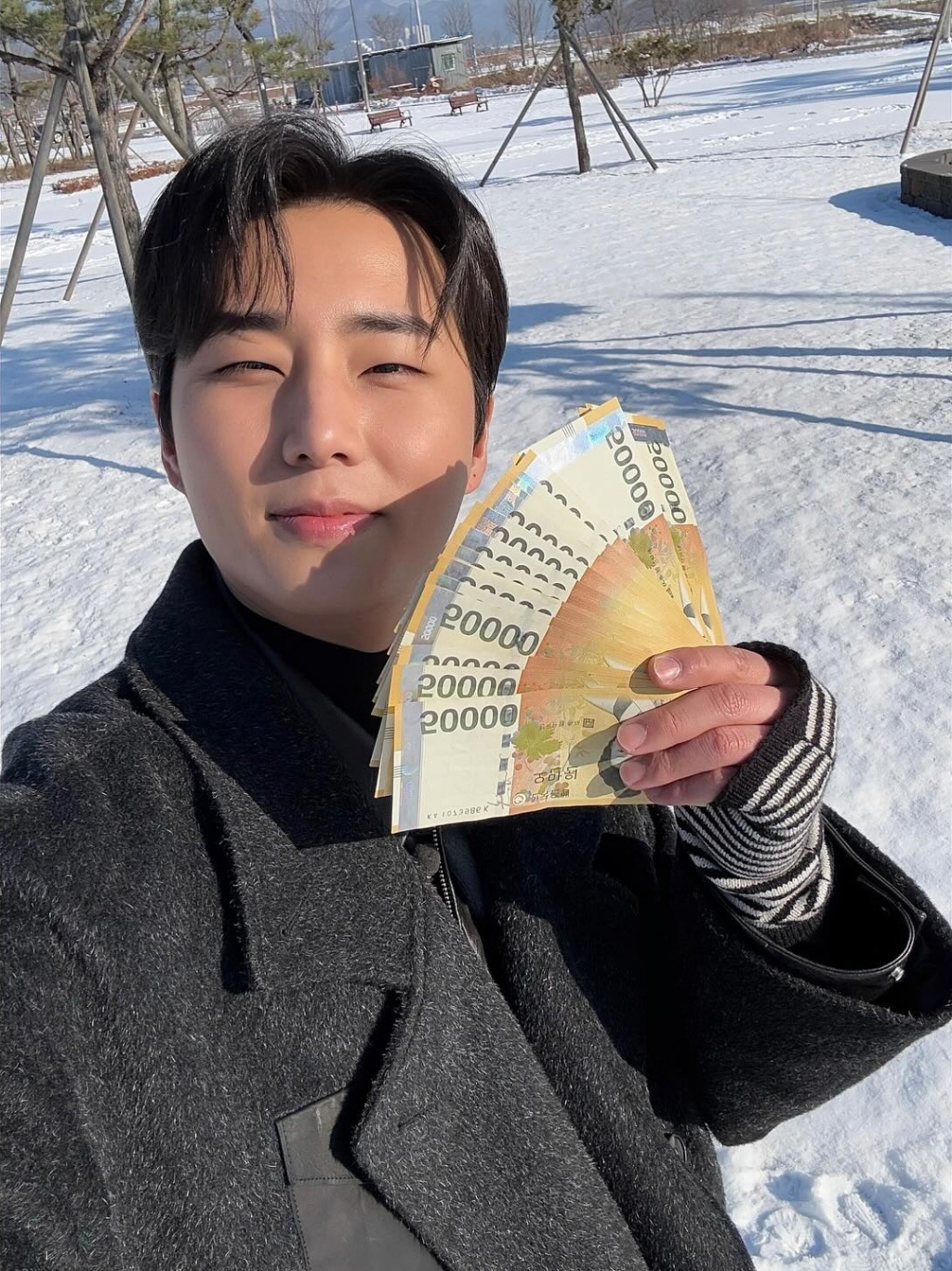 사진 속 영케이는 5만원 권 다발을 들고 환하게 웃고 있는 모습. 그는 눈이 소복하게 쌓인 공원에서 블랙 코트를 입은 채 훈훈한 비주얼을 뽐내고 있다.