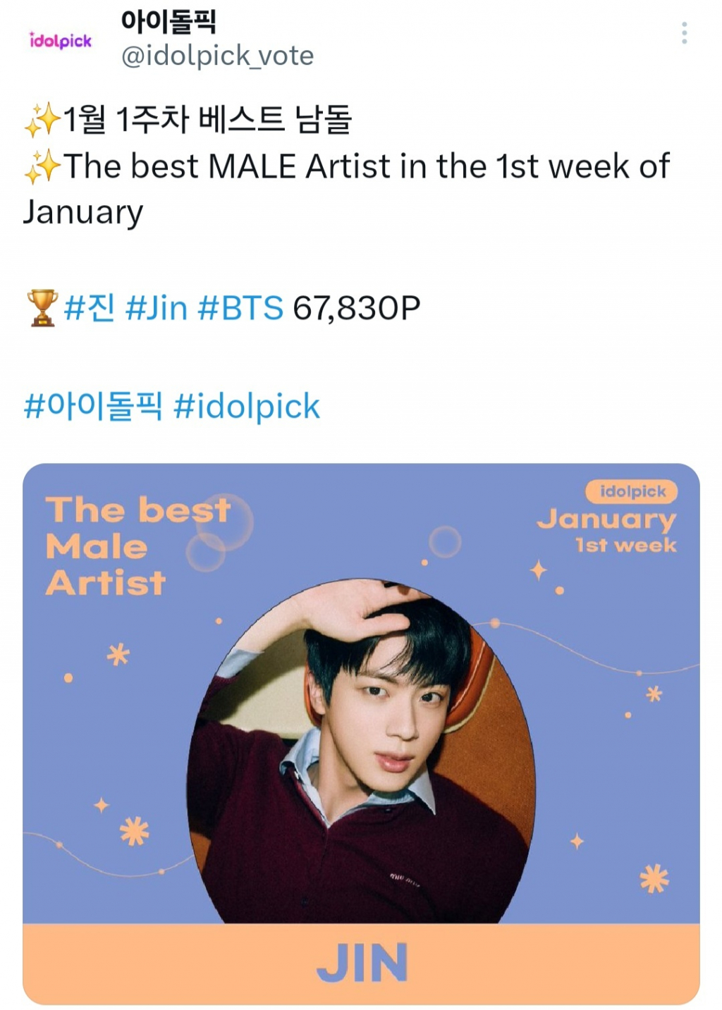 방탄소년단(BTS) 진이 아이돌픽(idolpick) 위클리 투표에서 최다 득표를 기록하며 인기를 빛냈다.