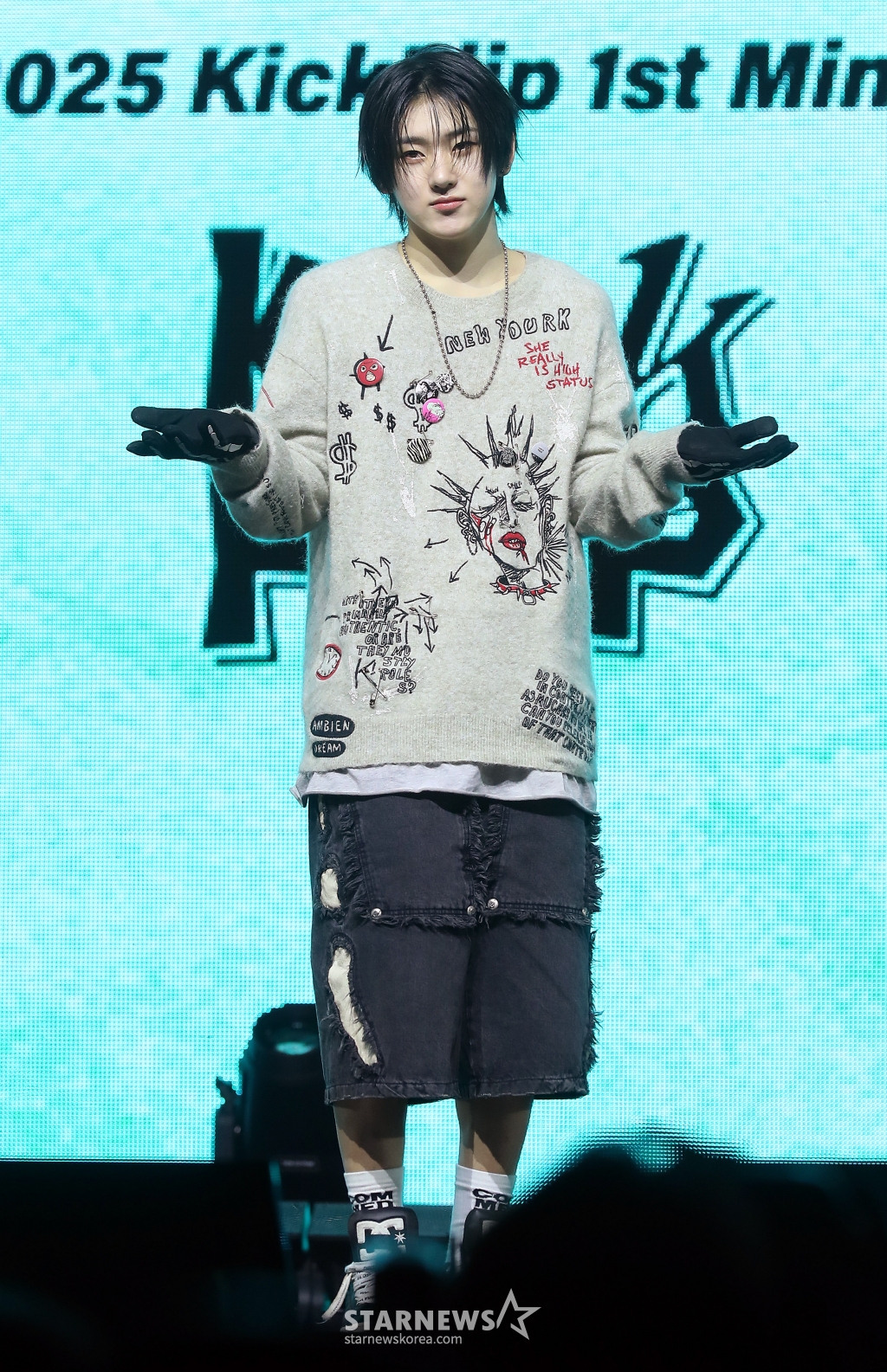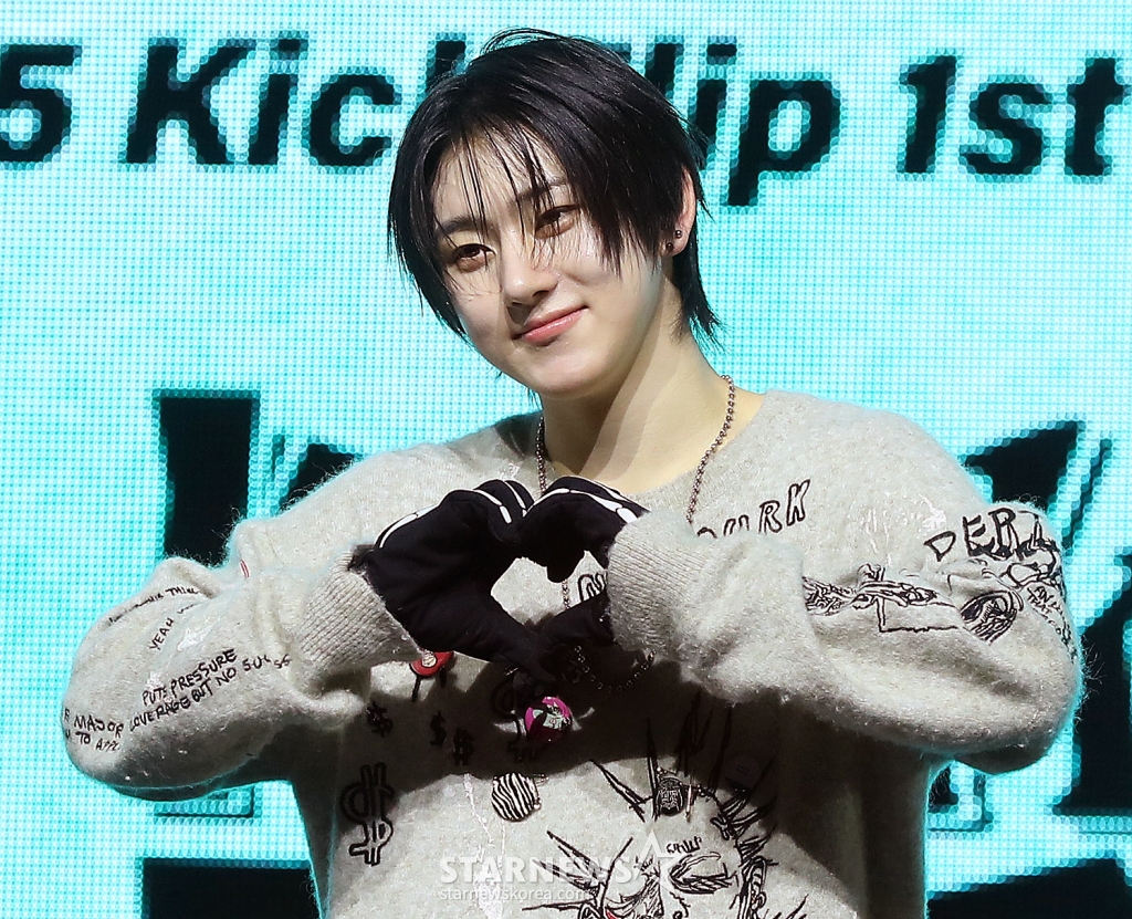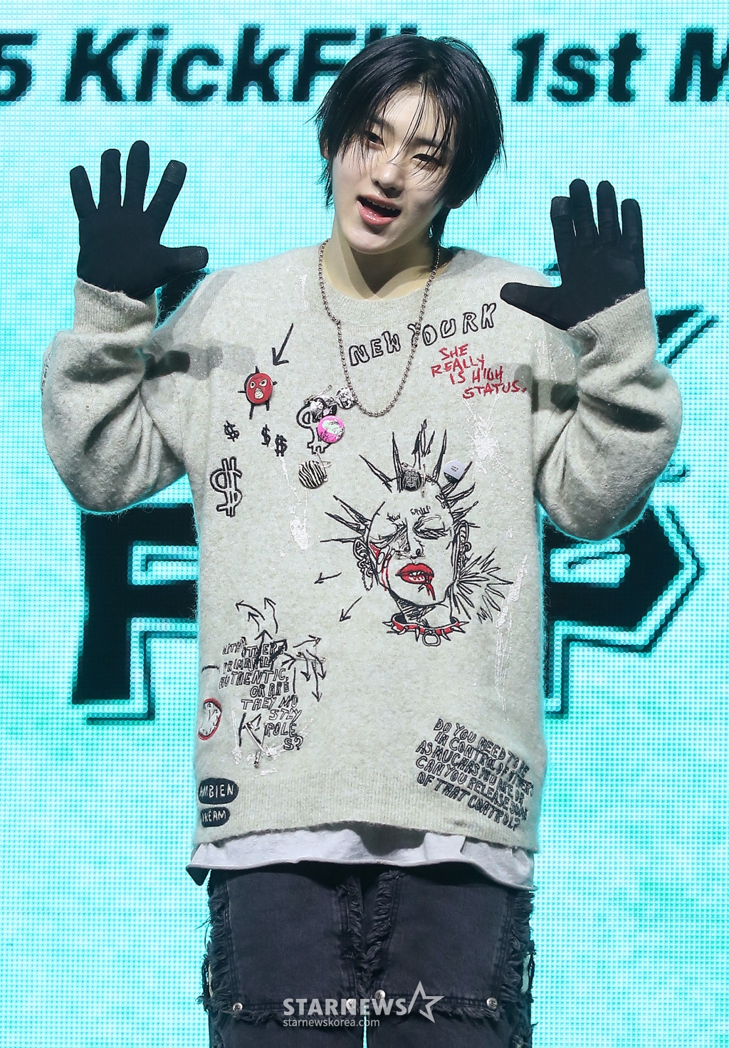 JYP 신인 그룹 킥플립(KickFlip) 계훈이 20일 오후 서울 광진구 예스24 라이브홀에서 진행된 첫 미니 앨범 'Flip it, Kick it!'(플립 잇, 킥 잇!) 발매 기념 쇼케이스에 참석해 포즈를 취하고 있다.