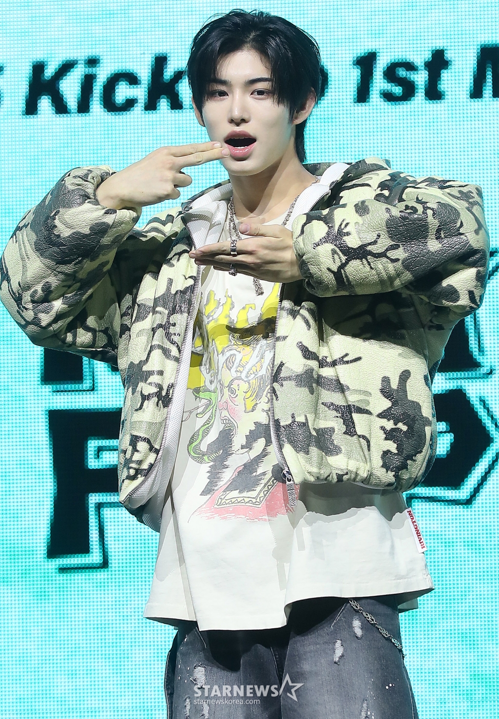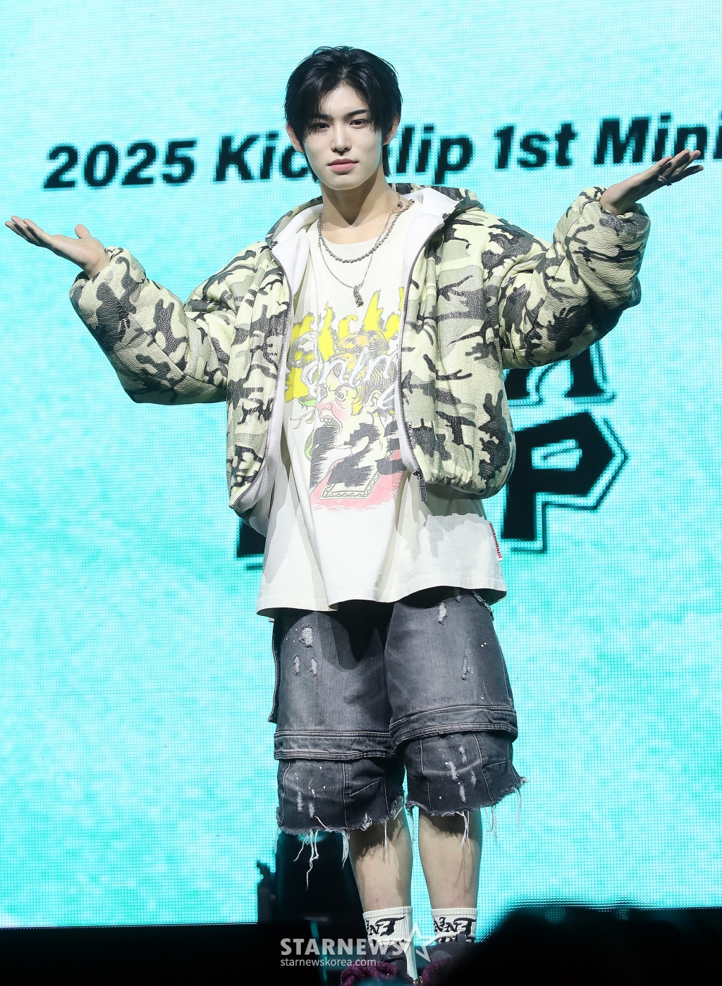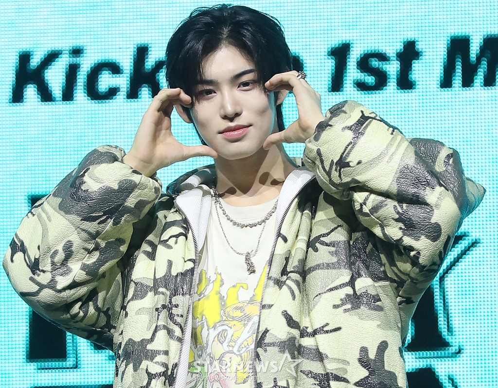 JYP 신인 그룹 킥플립(KickFlip) 민제가 20일 오후 서울 광진구 예스24 라이브홀에서 진행된 첫 미니 앨범 'Flip it, Kick it!'(플립 잇, 킥 잇!) 발매 기념 쇼케이스에 참석해 포즈를 취하고 있다.