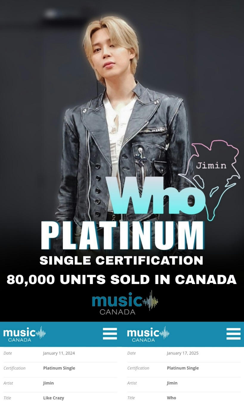 '라이크 크레이지'에 이어 '후'도 뮤직 캐나다의 플래티넘 인증을 받은 지민은 한국 가수 중 최초이자 유일하게 협업 없는 단독 솔로곡 2곡으로 다수의 뮤직 캐나다 플래티넘 인증을 획득하는 영예를 안았다.