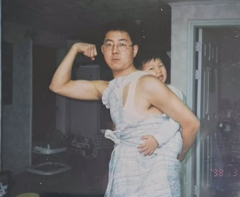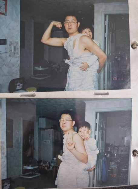 사진에는 RM이 어렸을 적 아버지의 등에 어부바 한 채 매달린 모습이 있었다.