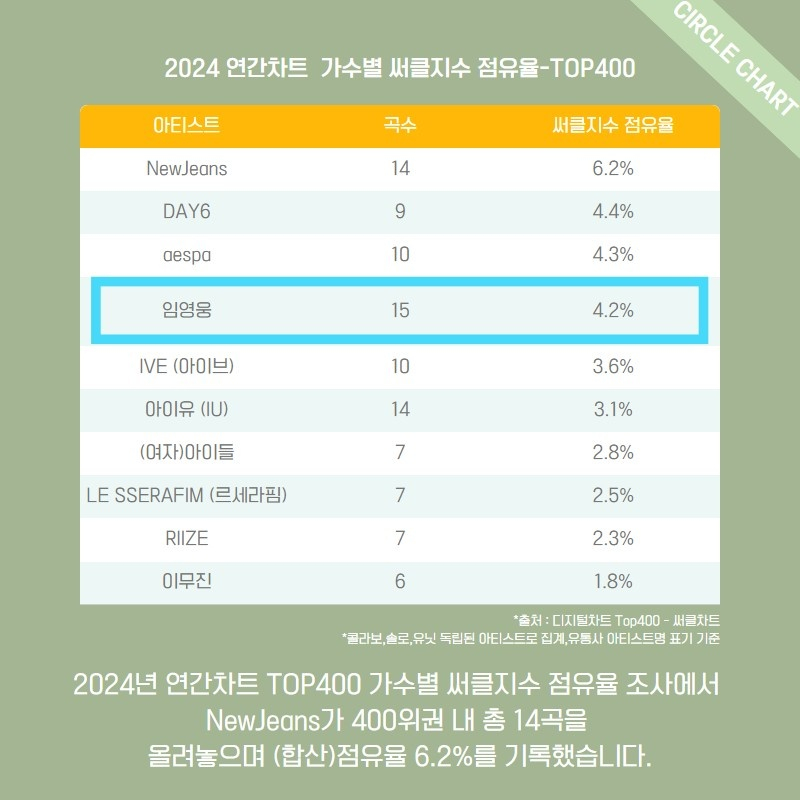 임영웅은 2024년 연간차트 TOP400 가수별 써클지수 점유율 조사에서 솔로 가수 1위를 차지했다.