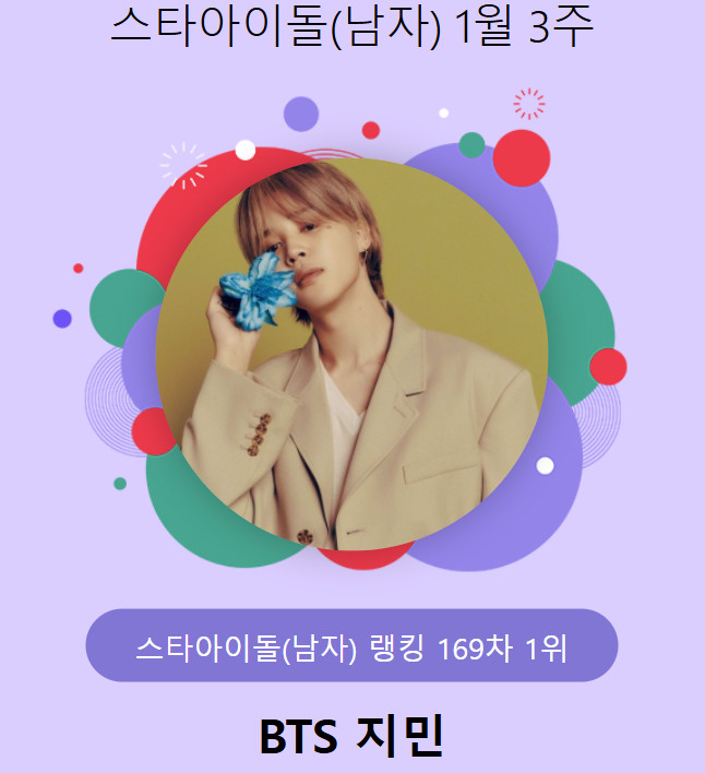 지민은 지난 16일 오후 3시 1분부터 23일 오후 3시까지 진행된 1월 3주(169차) 스타랭킹 스타아이돌 남자 부문 랭킹 투표에서 3만 9556표를 얻고 1위에 올랐다.