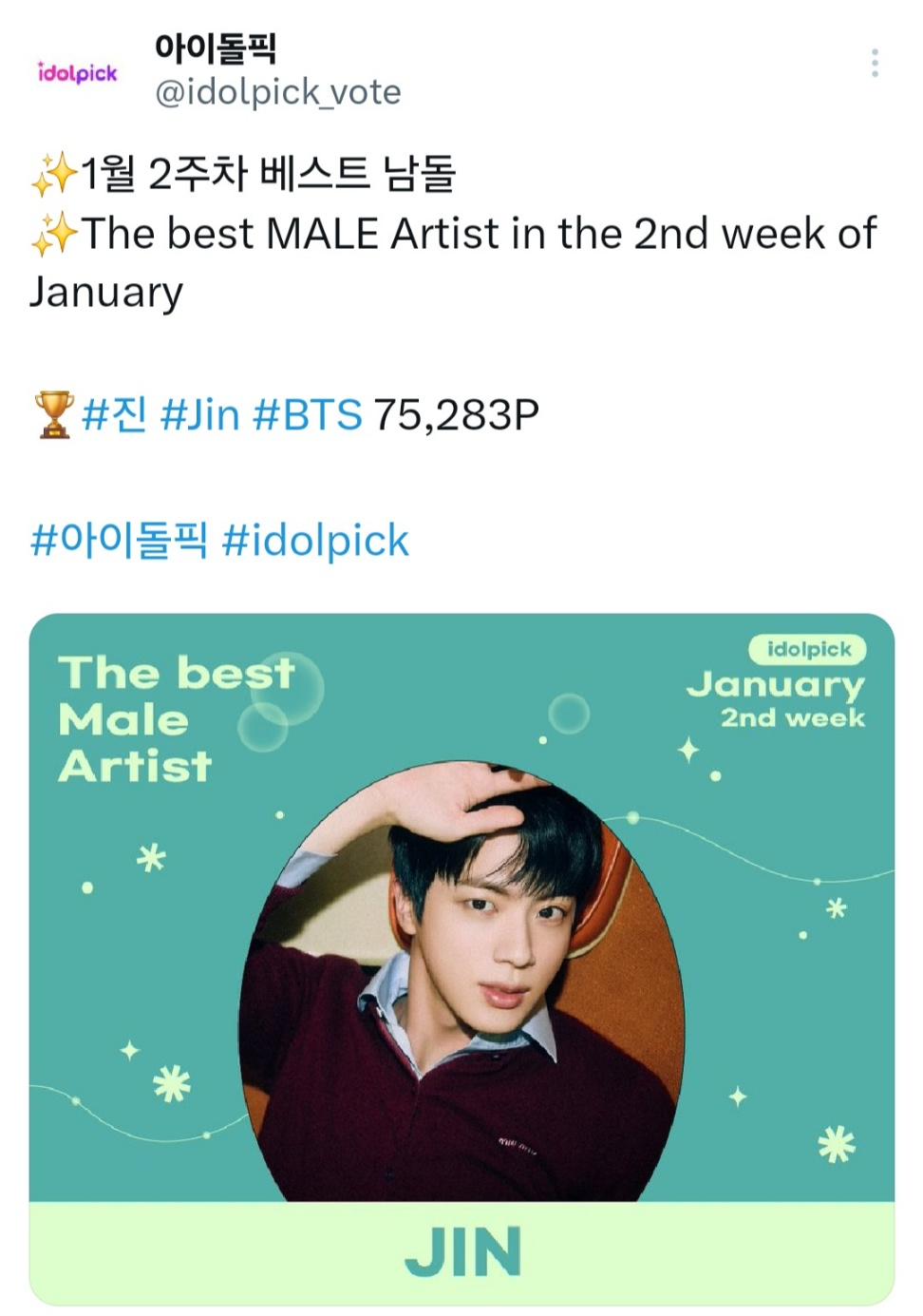방탄소년단(BTS) 진이 아이돌픽(idolpick) 위클리 투표에서 최다 득표로 전체 1위를 기록하며 인기를 빛냈다.