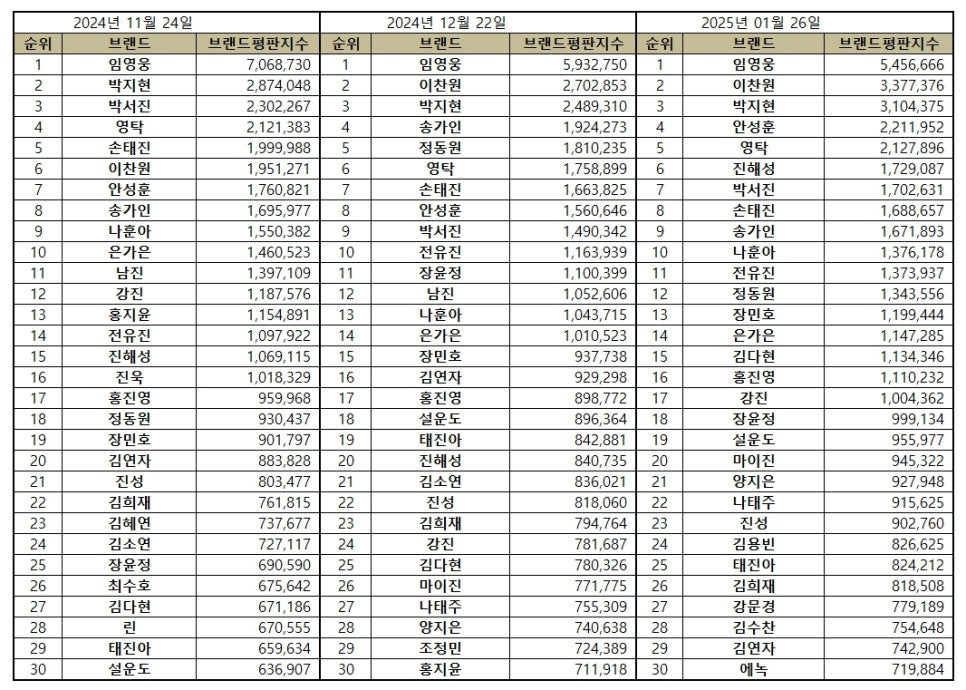 2025년 1월 트로트 가수 브랜드평판 30위 순위는 임영웅, 이찬원, 박지현, 안성훈, 영탁, 진해성, 박서진, 손태진, 송가인, 나훈아, 전유진, 정동원, 장민호, 은가은, 김다현, 홍진영, 강진, 장윤정, 설운도, 마이진, 양지은, 나태주, 진성, 김용빈, 태진아, 김희재, 강문경, 김수찬, 김연자, 에녹 순으로 분석됐다.