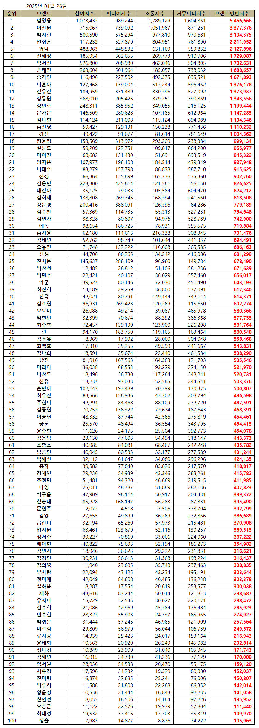 임영웅은 1월 26일 한국기업평판연구소가 발표한 트로트 가수 브랜드평판 2025년 1월 빅데이터 분석결과, 1위를 차지했다. 임영웅은 이로써 49개월 연속 트로트 가수 브랜드평판 1위를 기록했다. 1위 임영웅에 이어 2위 이찬원, 3위 박지현 순이었다.