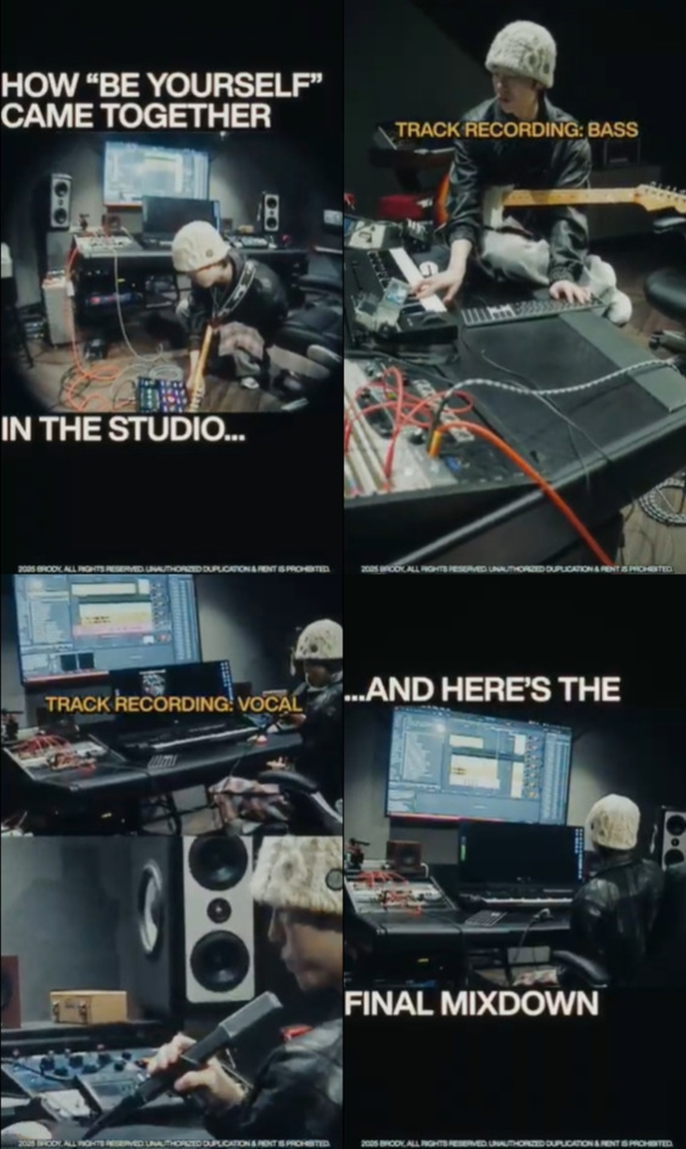 'BE YOURSELF' 레코딩 영상에서는 브로디의 자신감이 더욱 드러났다. 'BE YOURSELF' 녹음 중 브로디는 메트로놈을 켠 채 기타, 베이스, 드럼을 연주하며 음을 쌓고, 보컬을 입히는 등 프로듀싱 전 과정을 보여줬다.
