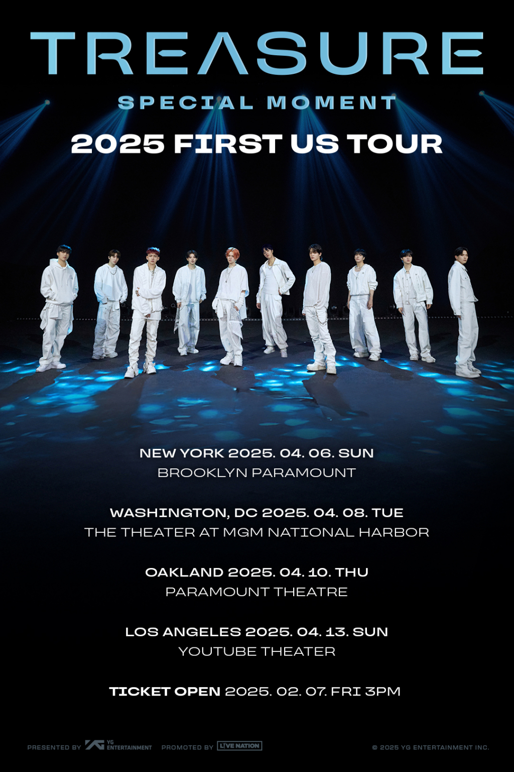 'TREASURE 2025 FIRST US TOUR [SPECIAL MOMENT]'의 예매는 오는 7일(현지시간) 오후 3시에 오픈된다. 자세한 정보는 YG 공식 홈페이지 내 미주 공연 공지문을 통해 확인 가능하다.