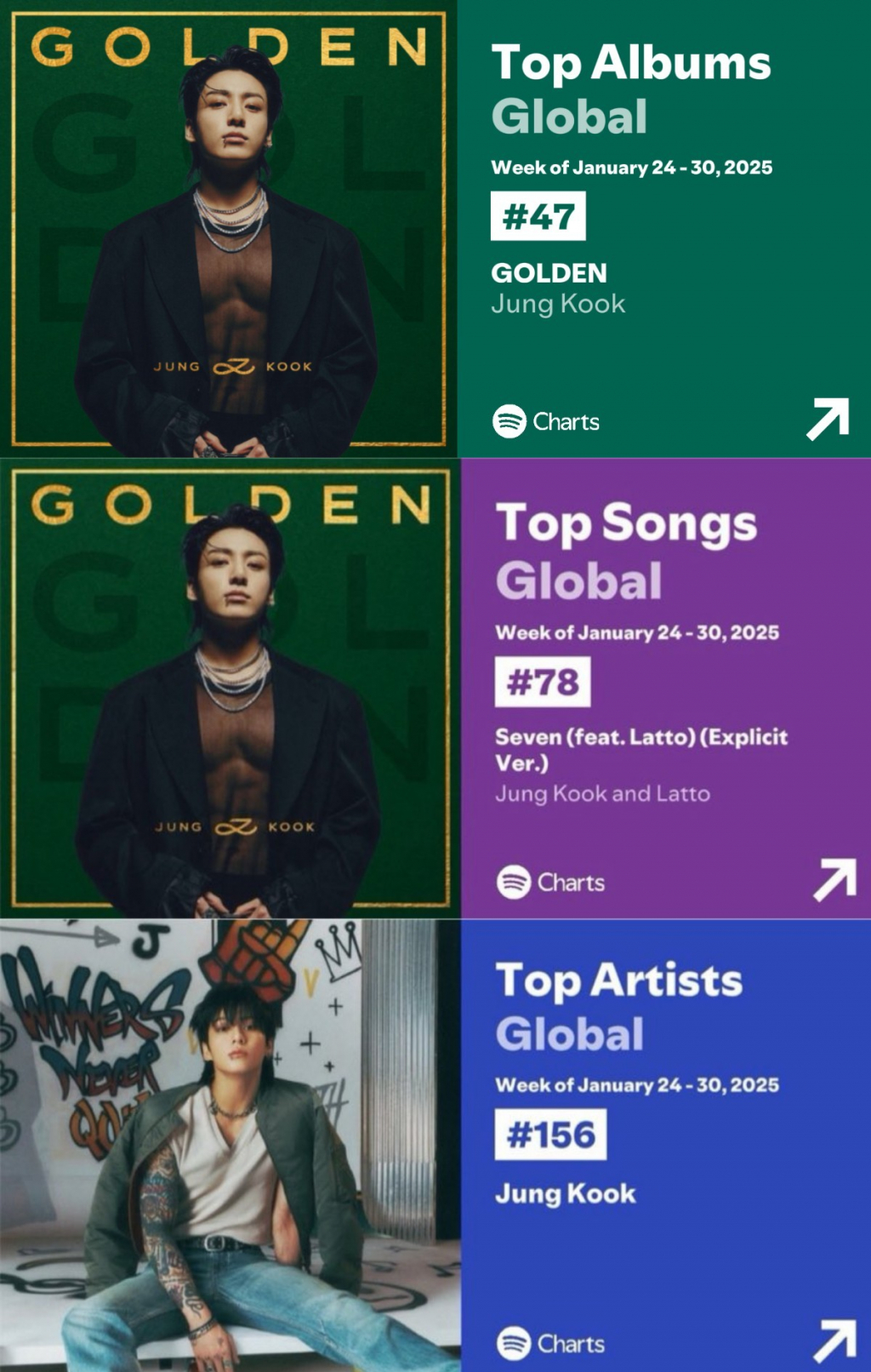 정국의 첫 솔로 앨범 'GOLDEN'은 세계 최대 음원 스트리밍 플랫폼 스포티파이(Spotify)가 발표한 최신 차트(1월 24일~30일) '위클리(주간) 톱 앨범 글로벌'에서 47위를 차지했다.