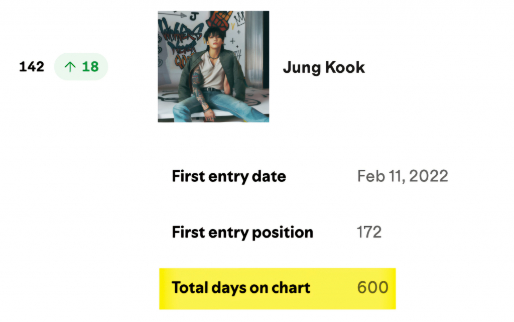 정국은 세계 최대 음원 스트리밍 플랫폼 스포티파이(Spotify)의 '글로벌 톱 아티스트' 차트에 통산 600일 동안 이름을 올렸다. 정국은 스포티파이 '글로벌 톱 아티스트' 차트에 K-팝 솔로 가수 최초로 600일 진입하는 신기록을 달성했다.