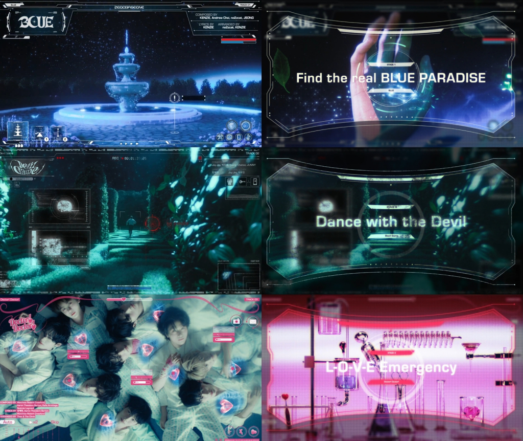 'Find the real BLUE PARADISE'라는 퀘스트 아래, 각 트랙 포스터는 블루 파라다이스를 찾아가는 아홉 멤버의 여정을 게임 스테이지를 하나씩 깨나가듯 풀어냈다.