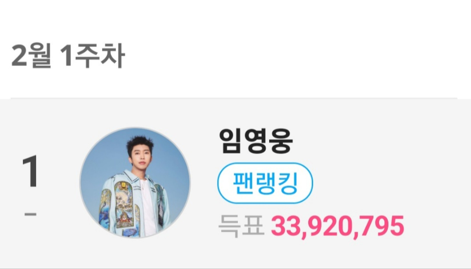임영웅은 2025년 2월 1주차 팬앤스타 솔로 랭킹에서 3392만 795표를 획득해 1위를 기록했다.