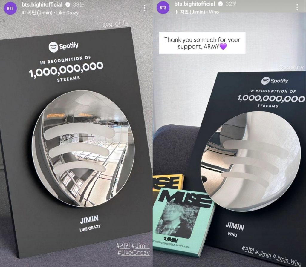 지민은 스포티파이 10억 스트리밍을 달성한 솔로곡 2곡(라이크 크레이지 & 후)을 보유한 최초이자 유일한 K팝 가수로서, 소속사의 신청에 따라 기념품이 전달되는 만큼 달성 시기에 비해 많이 늦어졌지만 스포티파이 10억 기념 인증패를 받아 팬들과 기쁨을 나눌 수 있게 되었다.