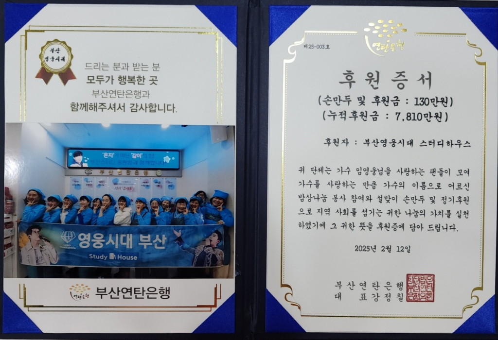 임영웅 팬클럽 부산영웅시대 '스터디하우스'는 2월 12일 부산연탄은행(대표 강정칠)에서 42차 정기 후원과 봉사를 했다.