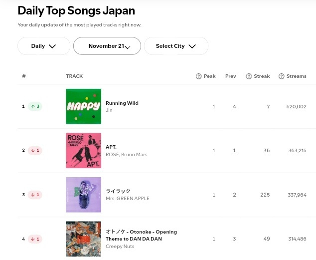 진의 첫 솔로 앨범 'Happy'의 타이틀곡 '러닝 와일드'(Running Wild)는 지난해 11월 21일 세계 최대 음원 스트리밍 플랫폼 스포티파이 재팬 데일리 톱 송 1위를 차지하며 스포티파이에서 단체와 솔로를 모두 포함한 역대 K팝 가수 중 가장 큰 스트리밍을 기록한 바 있다. 'Running Wild'는 이날 글로벌 스포티파이 톱 송 6위를 차지했다.