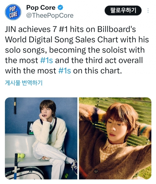 최근 발표된 미국 빌보드 월드 디지털 송 세일즈 차트(Billboard World Digital Song Sales chart)에서 지난 1월 26일 발표된 진이 부른 드라마 '별들에게 물어봐' OST '클로즈 투 유'(Close to You)가 1위를 차지하며 진은 총 7곡을 1위를 기록, 전 세계 솔로 중 역대 최다 1위 아티스트가 됐다.