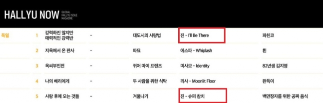 한편 진은 한국국제문화교류진흥원(KOFICE)이 발행하는 매거진 '한류나우(Hallyu Now)'에서 'KOFICE 해외특파원이 선정한 2024년 최고의 한류콘텐츠 5선' 중 솔로 앨범 '해피'(Happy)의 선공개곡 '아일 비 데어'(I'll Be There)로 1위와 자작곡 '슈퍼 참치'(Super tuna)로 5위를 차지했다. 진은 한국과 일본뿐 아니라 미국, 독일 등 세계 주요 음반 시장을 포함한 전 세계에서 폭발적인 인기를 실감케 하고 있다.