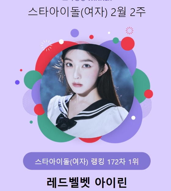 아이린은 지난 6일 오후 3시 1분부터 13일 오후 3시까지 진행된 2월 2주(172차) 스타랭킹 스타아이돌 여자 부문 랭킹 투표에서 1만 4760표를 얻고 1위에 등극했다.