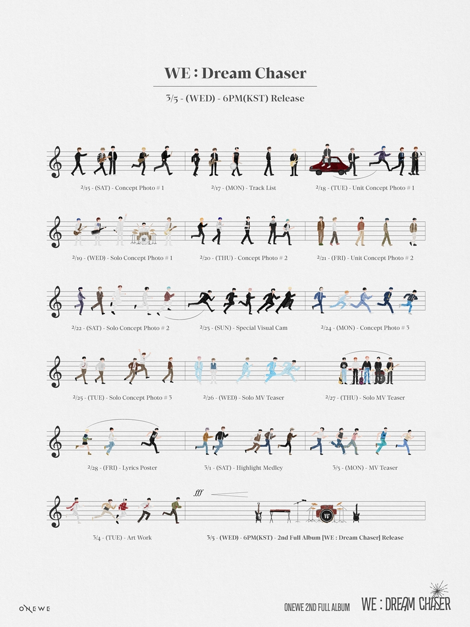 특히, 스케줄 플랜 이미지는 악보 형식으로 제작돼 눈길을 끈다. 오선지에는 데뷔부터 지금까지 원위의 모습을 음표로 형상화해 일러스트로 담았다. '꿈을 좇는 사람들'이라는 앨범 타이틀에 걸맞게, 앞을 향해 달려가는 모습으로 의미를 더했다. 'WE : Dream Chaser' 발매 당일에는 원위의 포지션 악기가 그려져 있어 눈길을 끈다.