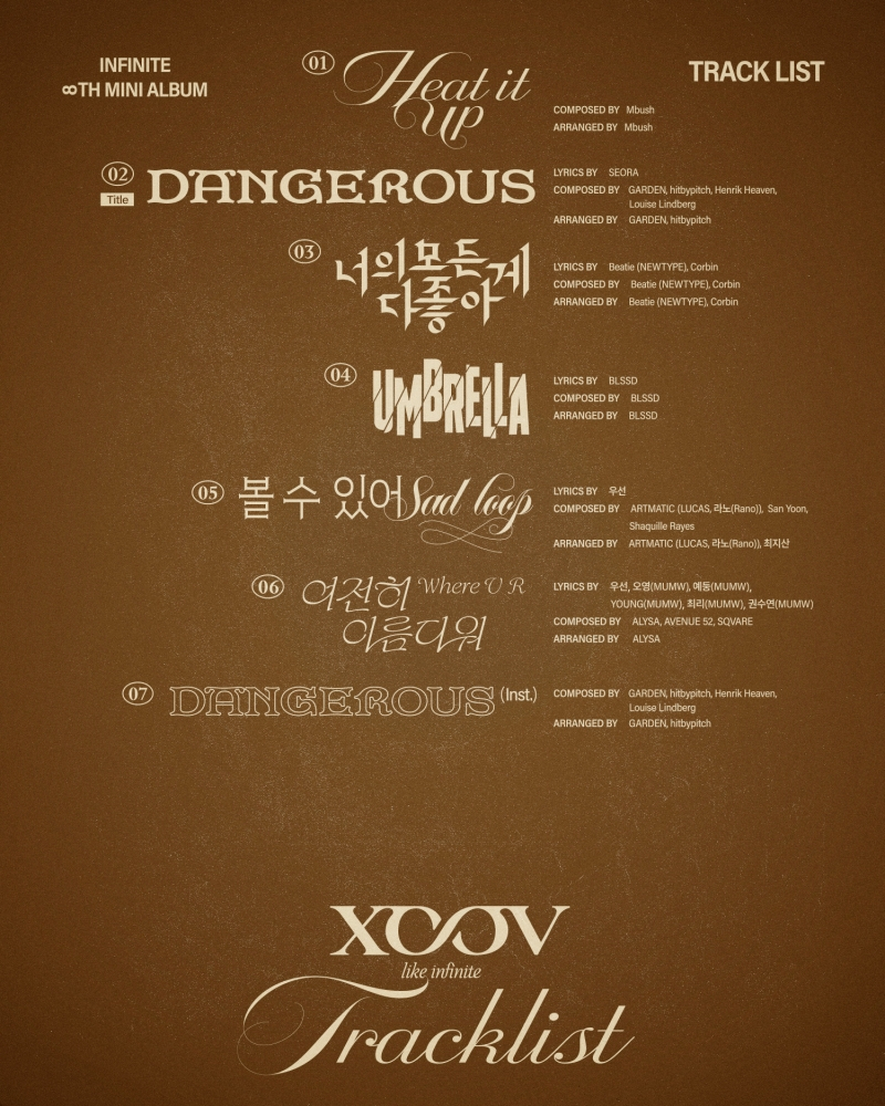 트랙리스트에 따르면 인피니트의 새 미니 앨범 타이틀곡은 '데인저러스(Dangerous)'다. 이 외에도 인트로 트랙 '히트 잇 업(Heat it up)'을 비롯해 '너의 모든 게 다 좋아', '엄브렐러(Umbrella)', '볼 수 있어(Sad Loop)', '여전히 아름다워(Where U R)', 그리고 타이틀곡 '데인저러스'의 인스트루멘탈(반주) 트랙까지, 인피니트의 독보적인 음색과 무한한 매력을 확인할 수 있는 총 7곡이 다채롭게 수록됐다.