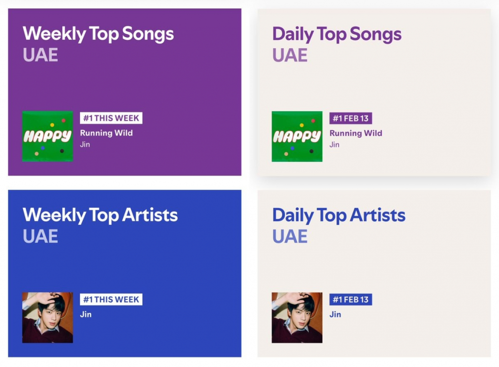 진은 세계 최대 음원 플랫폼 스포티파이(Spotify)에서 지난 14일(한국 시간) 발표된 UAE 주간 톱 송(Weekly Top Songs UAE), 주간 톱 아티스트 UAE(Weekly Top Artists UAE), 일간 톱 송 UAE(Daily Top Songs UAE), 일간 톱 아티스트 UAE(Daily Top Artists UAE)에서 모두 1위를 유지했다. 이로써 진은 10주 동안 이 모든 차트에서 동시 1위를 차지한 K팝 최고이자 유일한 기록을 가진 아티스트가 됐다.