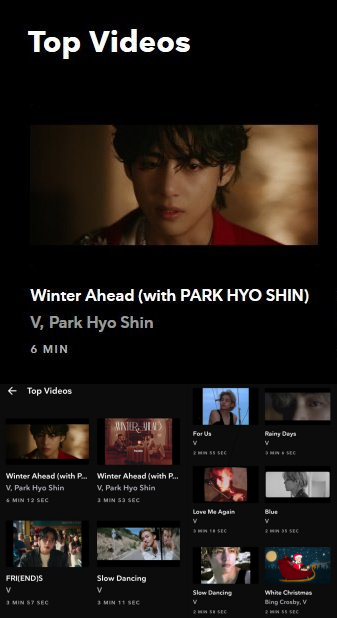 뷔의 솔로곡 'Winter Ahead(with PARK HYO SHIN)'는 고음질 글로벌 스트리밍 플랫폼 타이달 '호주 톱 비디오' 차트에 6일 연속 1위를 차지했다.