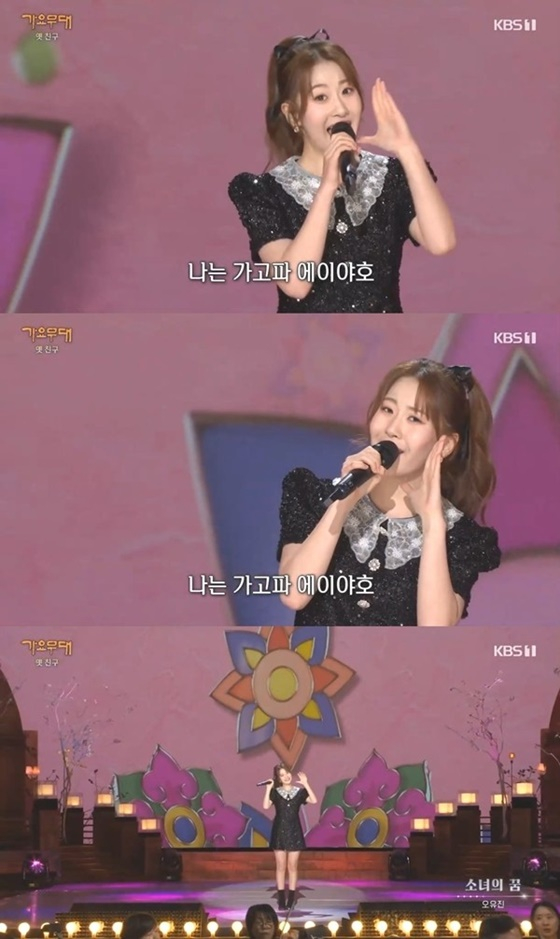 이날 옛 친구를 주제로 펼쳐진 무대에서 오유진은 블랙 원피스를 입고 단정하면서도 러블리한 매력을 드러냈고 박신자의 '소녀의 꿈'을 선곡, 맑고 청아한 목소리와 활력 넘치는 표정 연기로 완성도 높은 무대를 완성했다.