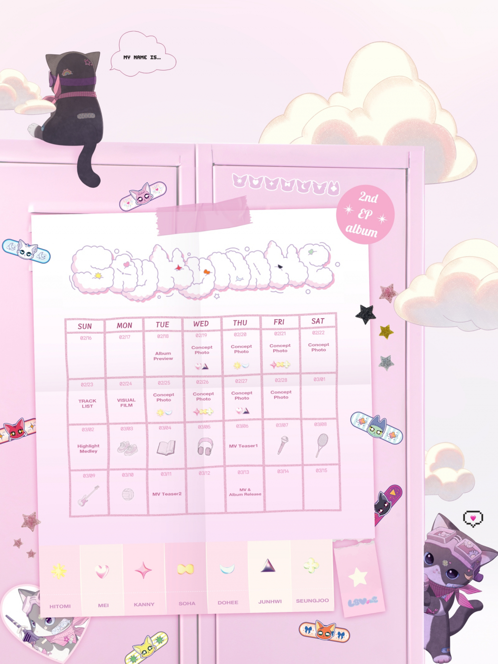 게다가 세이마이네임을 상징하는 고양이 캐릭터와 몽글몽글한 구름 등으로 사랑스러운 분위기를 표현하는 등 세이마이네임만의 러블리함으로 눈길을 사로잡았다. 공개된 컴백 타임테이블 이미지 속 운동화, 헤드셋, 마이크 등의 그림으로 표시된 콘텐츠들은 궁금증을 더했다.