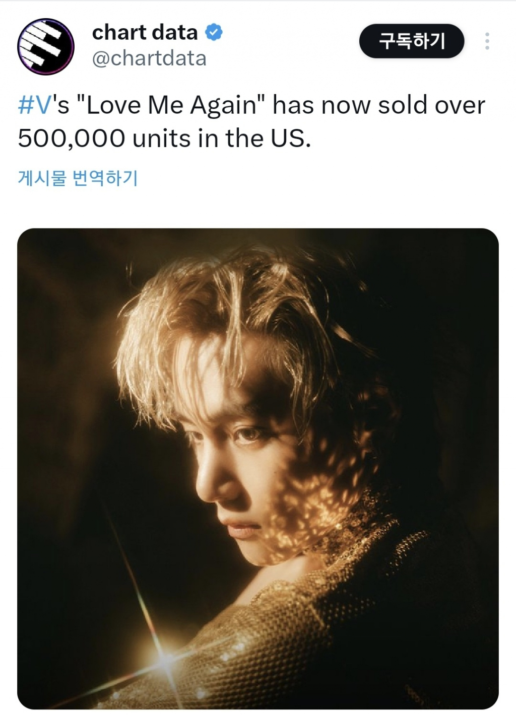 방탄소년단(BTS) 뷔의 솔로곡 '러브 미 어게인'(Love Me Again)이 미국에서 50만 유닛을 판매를 기록해 RIAA 골드 인증을 추가했다.