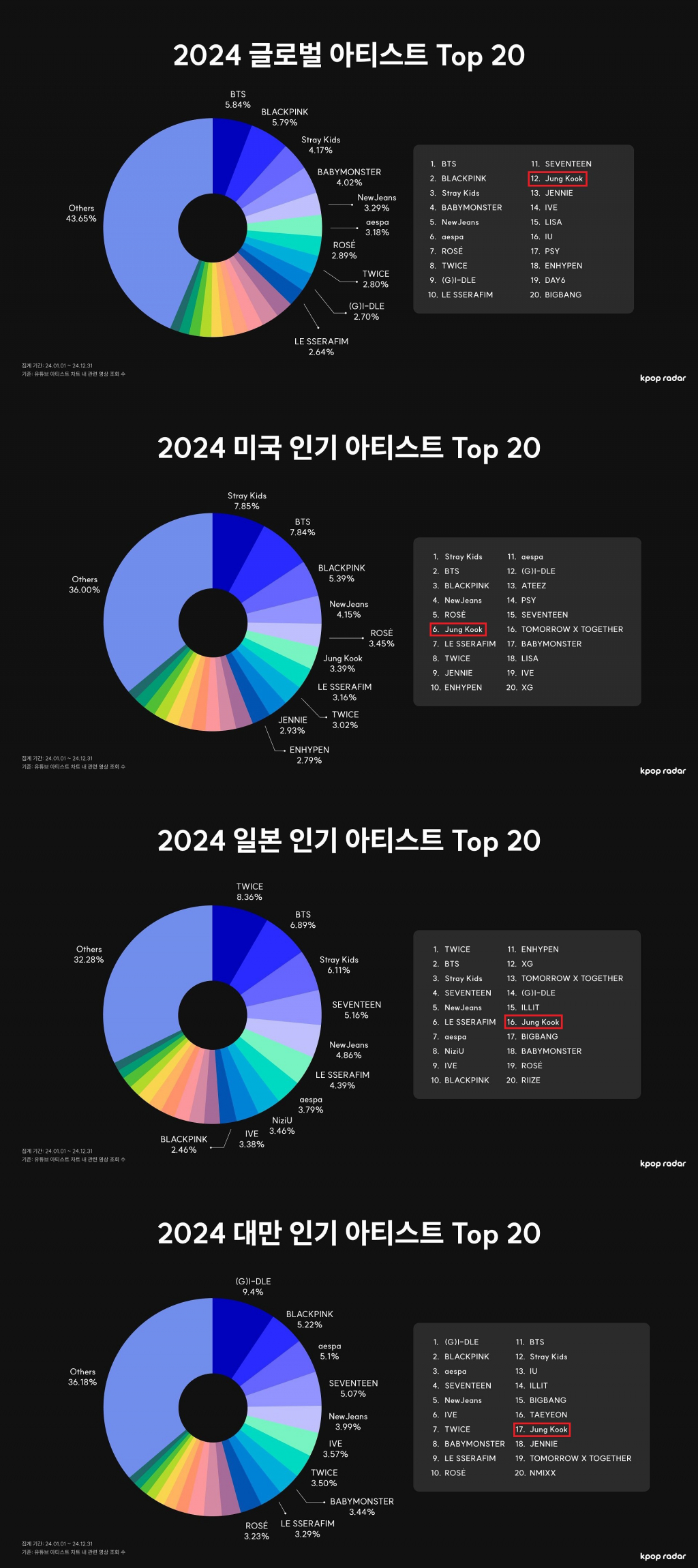 정국은 케이팝레이더가 발표한 2024년 전 세계에서 가장 인기 있었던 K-팝 아티스트 20인 리스트 '2024 글로벌 아티스트 톱 20'에서 12위를 차지했다.