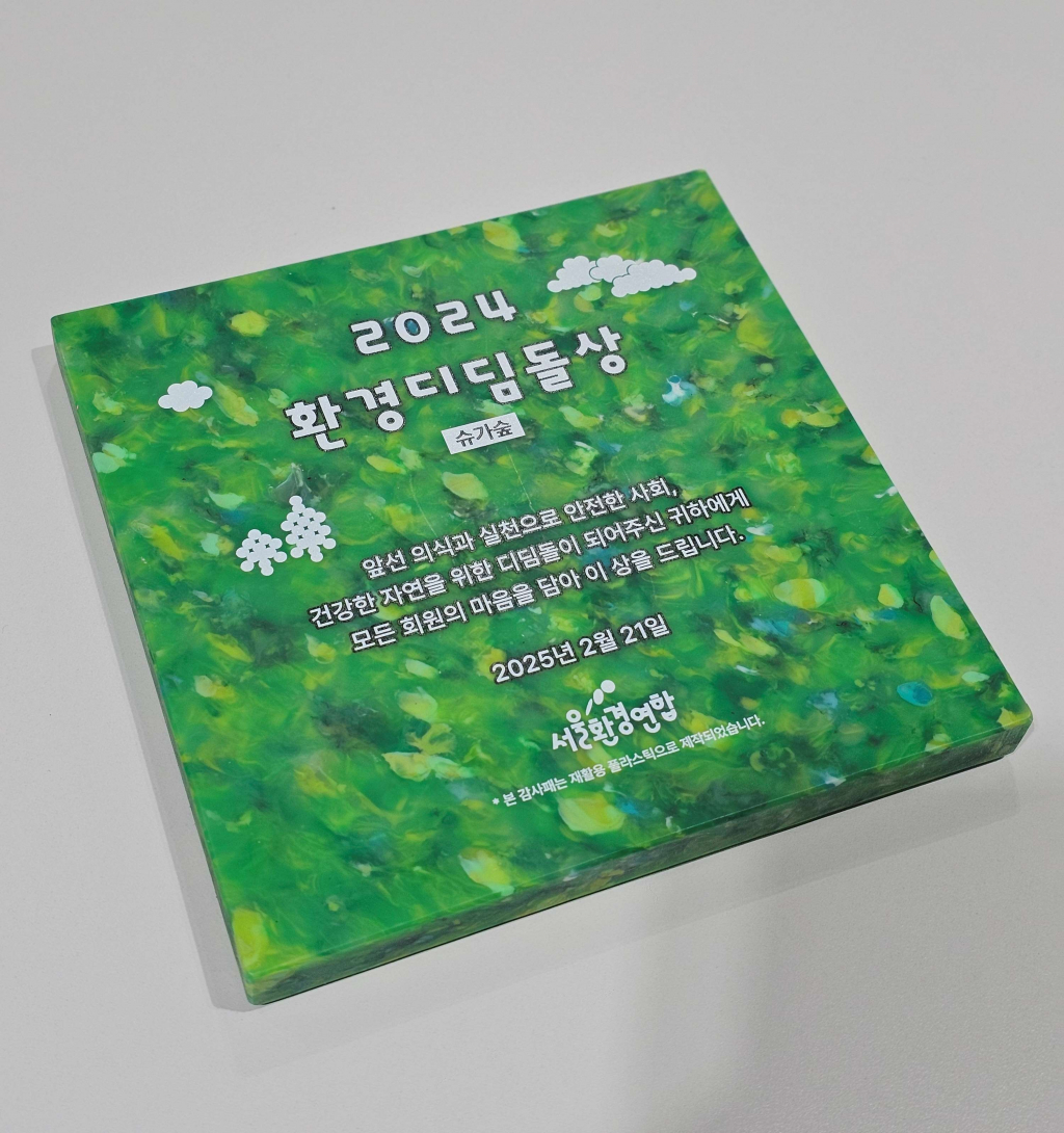 환경디딤돌상은 서울환경연합이 서울의 환경 보호에 기여한 단체 및 개인에게 수여하는 상으로, 슈가숲은 지속적인 환경 보호 활동과 긍정적인 영향력을 인정받아 수상하게 됐다. 특히, 이번 수상의 상패는 재활용 플라스틱 판재로 제작되어 환경 보호의 의미를 더욱 강조했다.