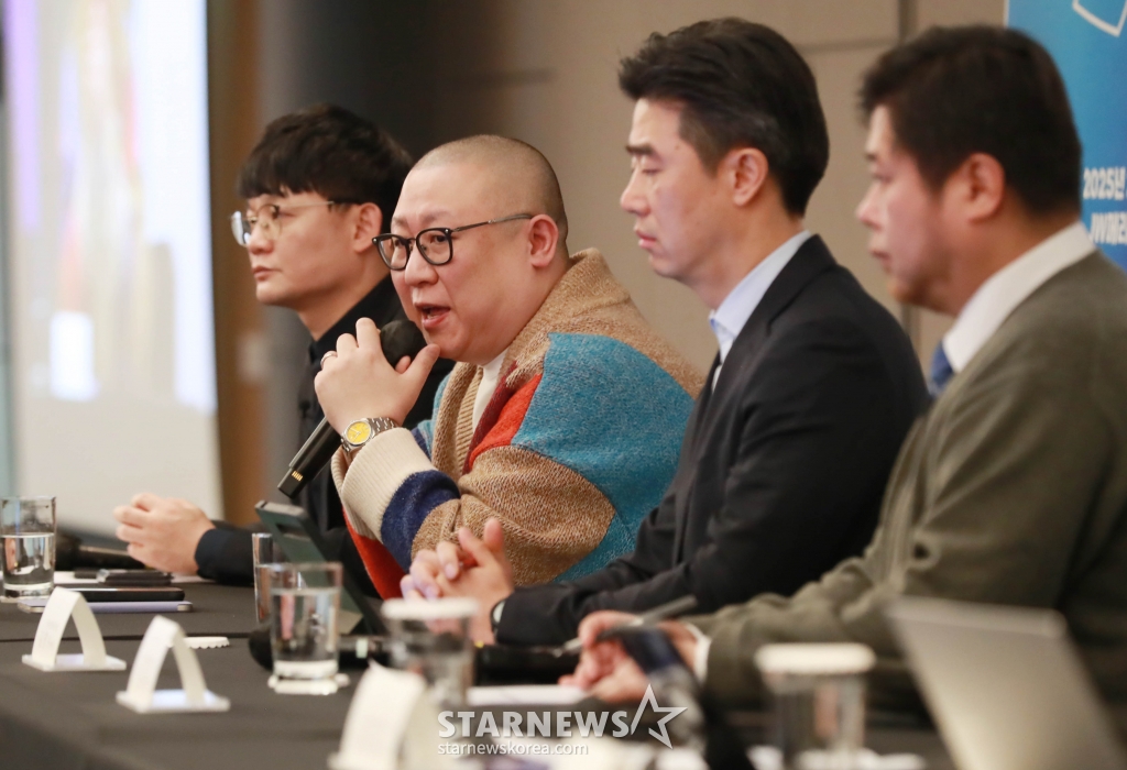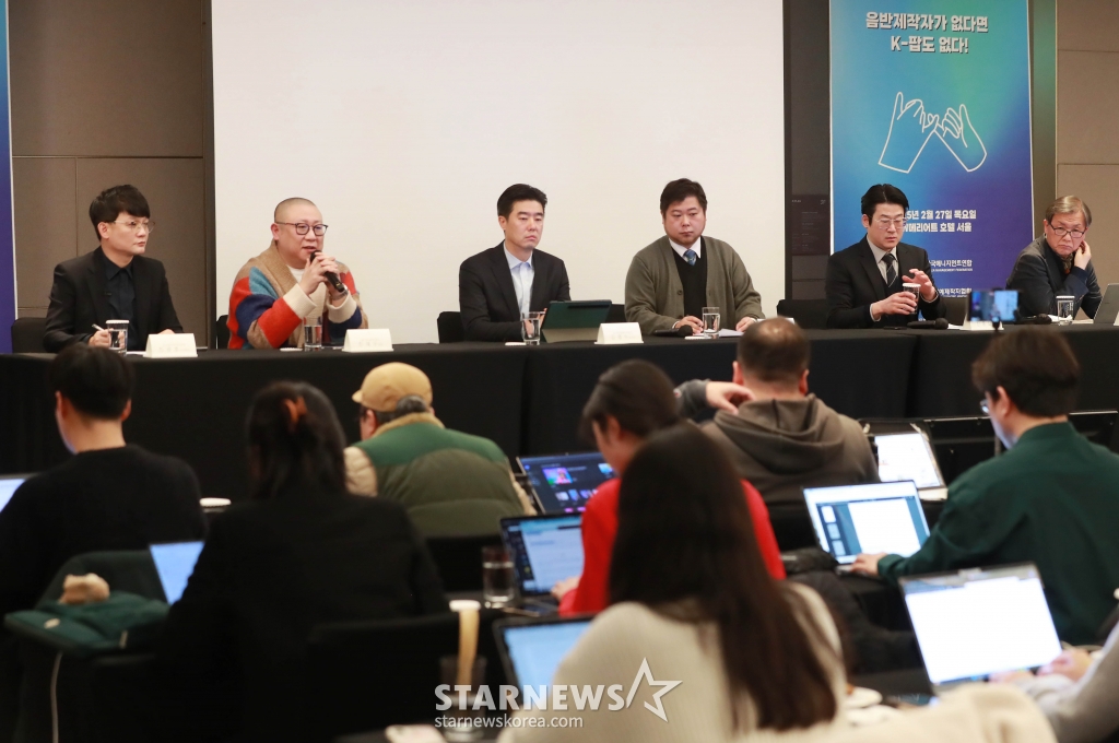 한국매니지먼트연합(한매연), 한국연예제작자협회(연제협), 한국음악레이블산업협회(음레협), 한국음반산업협회(음산협), 한국음악콘텐츠협회(음콘협)는 27일 오전 서울 서초구 반포동 JW 메리어트 호텔 서울에서 '음반제작자가 없다면 K-팝도 없다'라는 주제로 기자회견을 개최했다. 한매연 이명길 이사, 연제협 임백운 회장, 음레협 박강원 이사, 음산협 최경식 회장, 음콘협 김창환 회장이 참석했다.