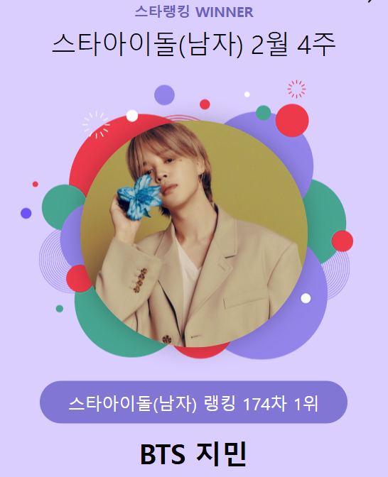 지민은 지난 20일 오후 3시 1분부터 27일 오후 3시까지 진행된 2월 4주(174차) 스타랭킹 스타아이돌 남자 부문 랭킹 투표에서 4만2308표를 받으며 1위에 올랐다.
