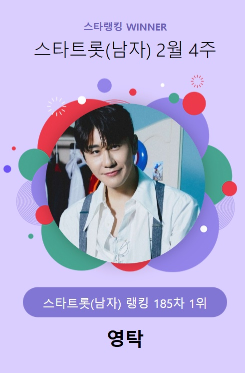 영탁은 지난 20일 오후 3시 1분부터 27일 오후 3시까지 진행된 2월 4주(185차) 스타랭킹 스타트롯 남자 랭킹 투표에서 10만 3872표를 얻고 1위에 등극했다.
