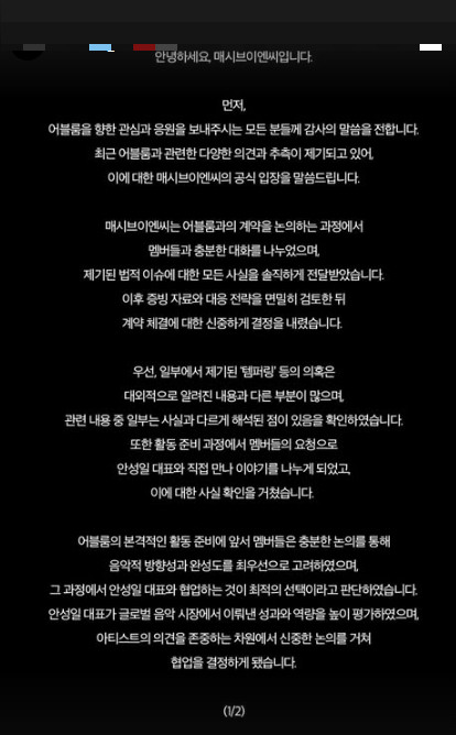 이어 매시브이엔씨는 템퍼링 의혹과 관련, "대외적으로 알려진 내용과 다른 부분이 많으며 관련 내용 중 일부는 사실과 다르게 해석된 점이 있음을 확인했다"라며 "활동 준비 과정에서 멤버들의 요청으로 안성일 대표와 직접 만나 이야기를 나누게 됐고 이에 대한 사실확인을 거쳤다"라고 강조했다.