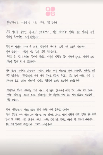 한편 아란 새나 시오는 이날 어블룸 공식 SNS를 통해 손편지를 공개하고 "2023년 10월 전속계약 해지 후 오랜 시간 고립된 상태에서 지내왔다. 세상에 나갈 힘이 없던 시기였다. 그러던 중 현 소속사를 만나게 되었고, 저의의 상황을 깊이 이해해 주시고 배려해 주신 덕분에 함께 할 수 있었다"라고 전했다.