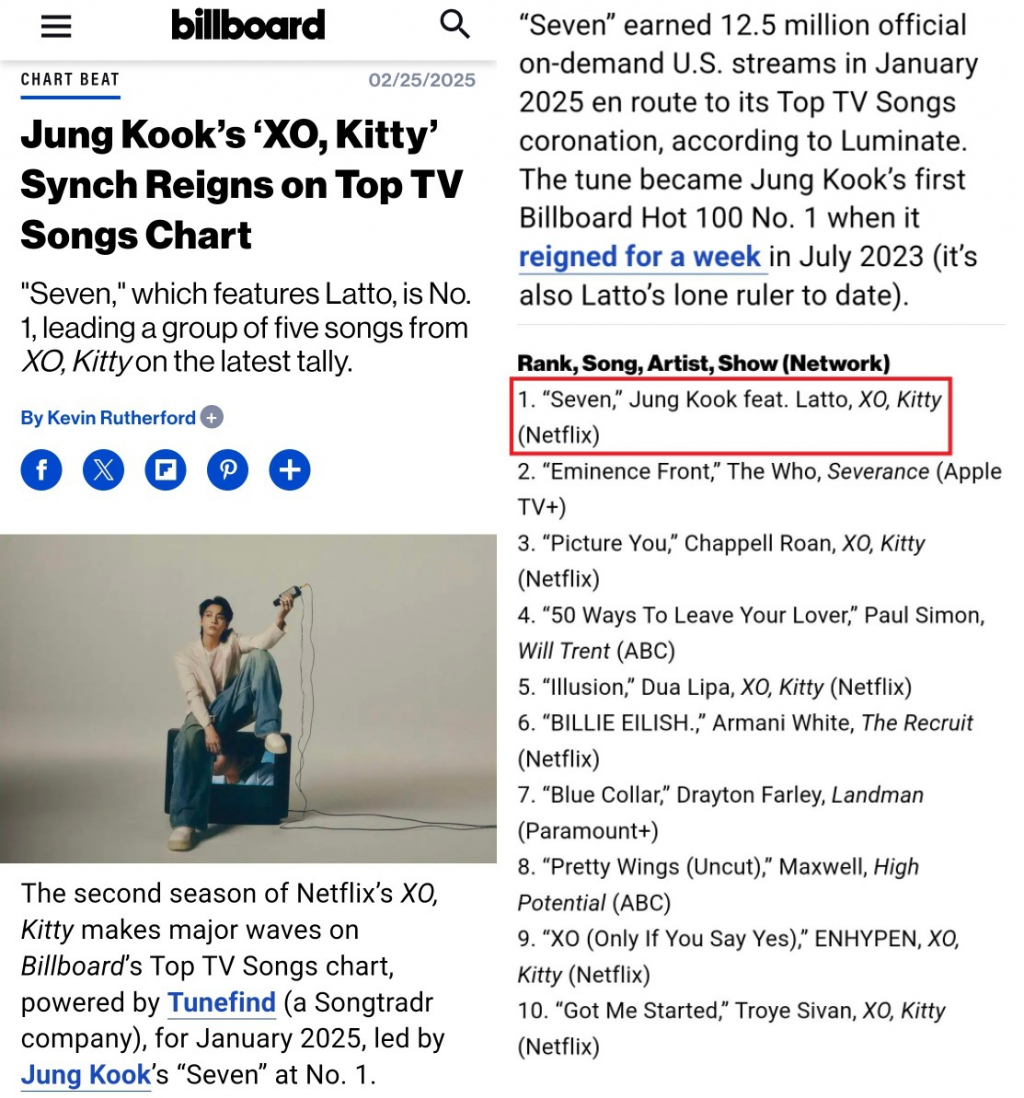 미국 음악 전문 매체 빌보드가 25일(현지 시각) 보도한 기사에 따르면, 정국의 첫 솔로 데뷔곡 'Seven'은 2025년 1월 빌보드 '톱 TV 송' 차트에서 1위를 차지했다.