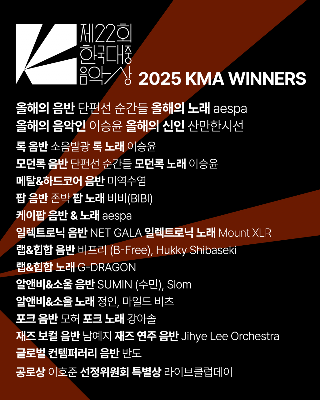 특히 에스파와 이승윤은 종합분야와 함께 장르 분야 2개 부문도 석권, 나란히 3관왕의 위업을 달성했다. 에스파는 최우수 케이팝 음반 및 노래 부문에서, 이승윤은 최우수 록, 최우수 모던록 노래상을 각각 수상했다.