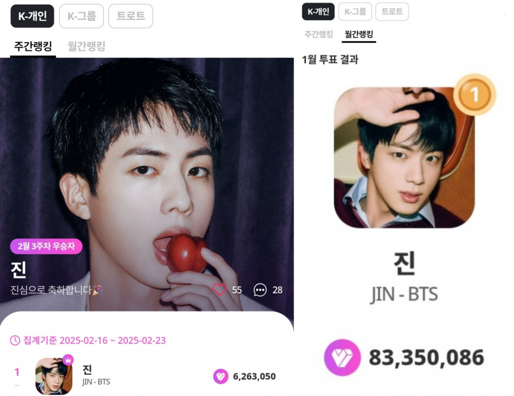 진은 지난 1월 'K-POP 개인 부문 월간랭킹'에서 총 누적 하트수 8335만 86개를 얻으며 압도적인 표수로 1위에 올랐다. 이로써 진은 13개월 연속 월간랭킹 1위를 기록했다.