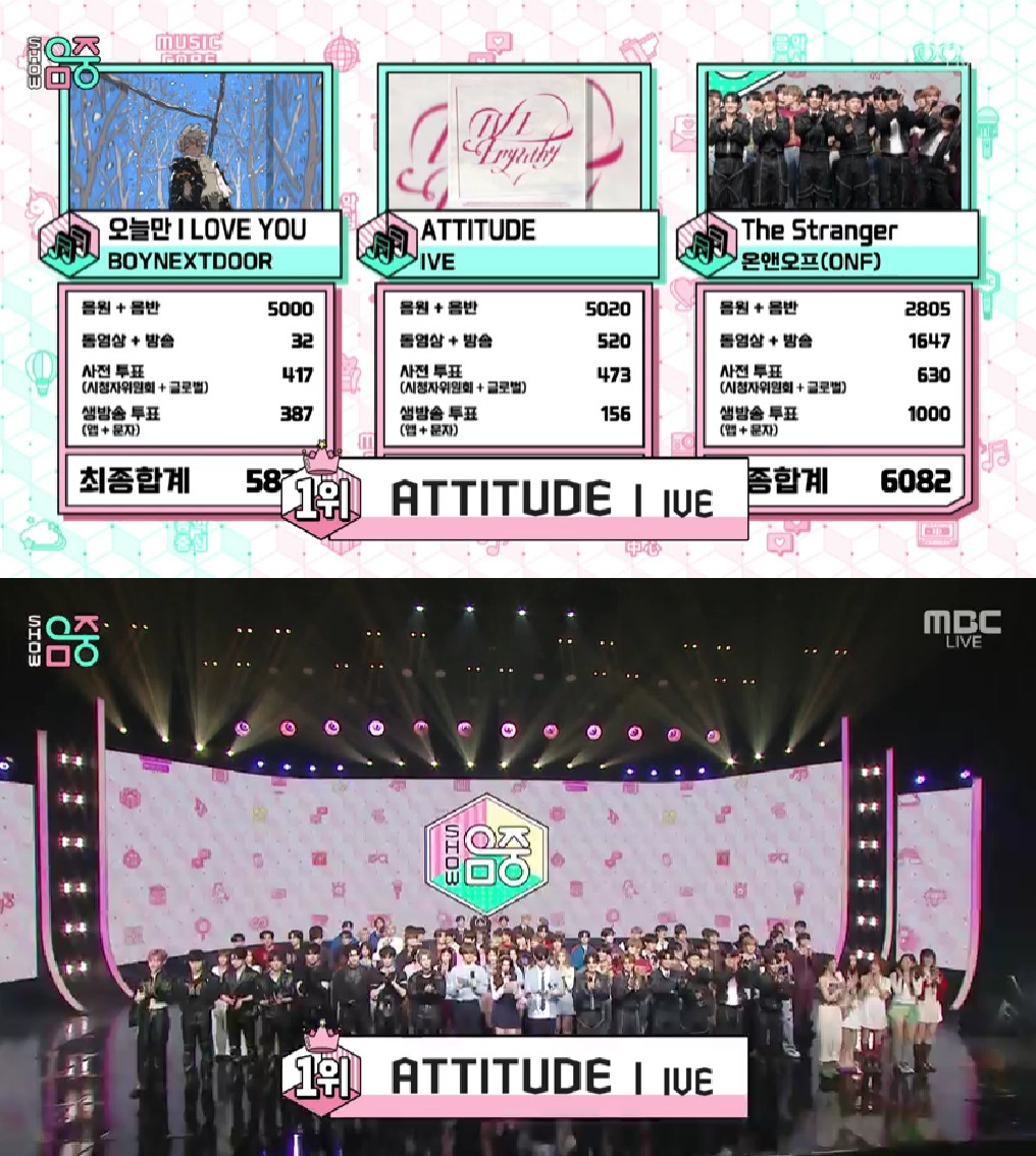 이날 1위의 주인공은 아이브였다. '애티튜드'는 바꿀 수 없는 상황에서 유일하게 바꿀 수 있는 것은 상황을 받아들이는 자신의 태도뿐이기에 상황을 유쾌하게 받아들이기로 한 '아이브적 사고'가 담긴 곡이다. 아이브의 1위가 발표되자 소속사 후배인 그룹 키키 멤버들이 기뻐하는 모습을 보여 눈길을 끌었다.