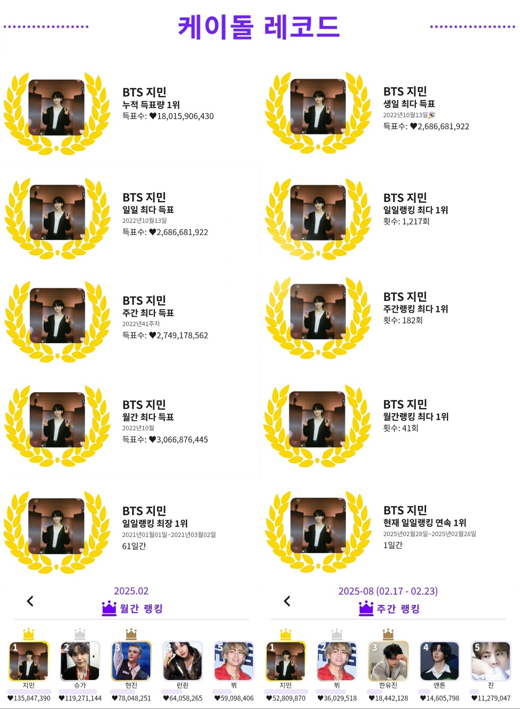 지민은 3월 1일 기준 누적득표량 1위(179억 3657만 1520), 일일랭킹 최다 1위(1,217회), 주간랭킹 최다 1위(182회)와 월간랭킹 최다 1위(41회), 일일과 생일 최다 득표 각각 1위(26억 8668만 1992), 주간 최다 득표 1위(27억 4917만 8562), 월간 최다 득표1위(30억 6687만 6445)에 이어 일일랭킹 최장 1위(61일간)와 2월 28일 일일 랭킹 1위까지 명예의 전당 10관왕을 유지하고 있다.