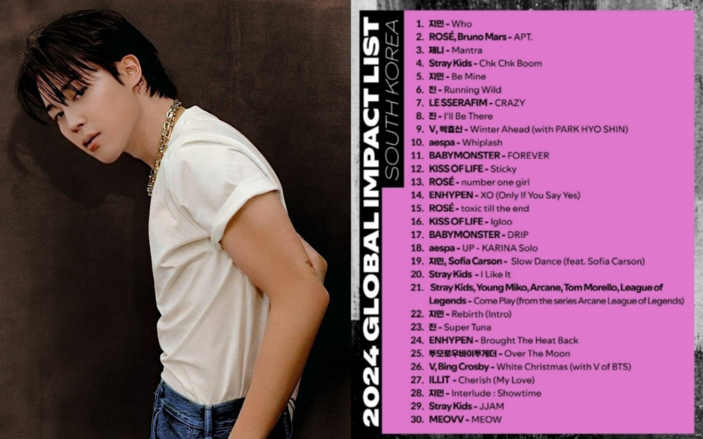 '글로벌 임팩트 리스트'는 2024년 하반기 해외에서 가장 많이 스트리밍된 한국 음악을 선정한 것으로, 해당 리스트 1위 '후'에 이어 지민의 2집 '뮤즈'(MUSE)에 수록된 비마인(Be Mine)이 5위, 슬로우 댄스(Slow Dance) 19위, 리버스(Rebirth)가 22위, 인털루드 쇼타임(Interlude : Showtime)이 28위를 기록하며 지민은 총 5곡의 이름을 올렸다.