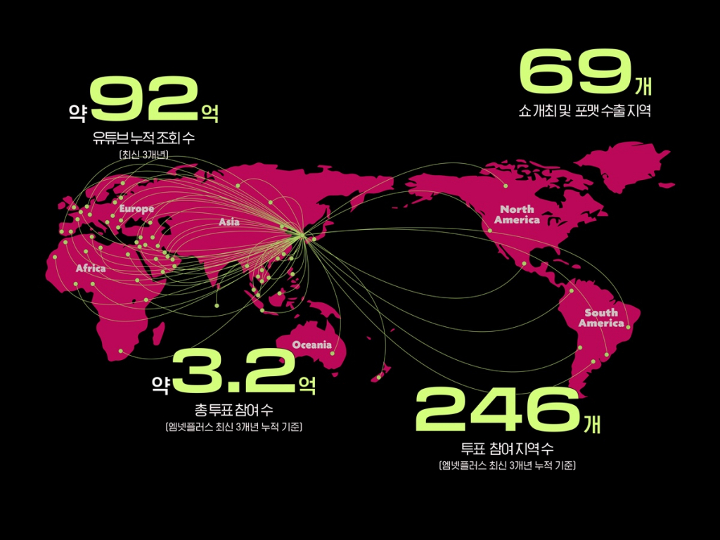 그동안 다양한 글로벌 서바이벌 프로젝트는 물론, World No.1 K-POP 차트쇼 '엠카운트다운', 세계 최대 K-POP Fan & Artist Festival 'KCON'과 글로벌 대표 K-POP 시상식 'MAMA AWARDS' 등을 통해 세대와 지역의 경계를 뛰어넘어 음악으로 하나되는 추억을 선사해온 Mnet은 글로벌로 영향력을 확장해왔다. 최근 3개년 성과를 돌아보면 유튜브 누적 조회수가 약 92억뷰를 달성했으며, 엠넷플러스 투표 데이터의 경우 246개 지역에서 약 3.2억 건에 육박하는 투표수를 기록했다. 또한 30년 동안 쇼 개최를 비롯해 포맷을 수출한 지역 숫자 만도 69개에 달한다.