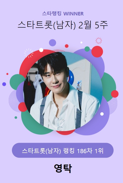 영탁은 지난달 27일 오후 3시 1분부터 6일 오후 3시까지 진행된 2월 5주(186차) 스타랭킹 스타트롯 남자 랭킹 투표에서 10만 5438표를 얻고 1위를 차지했다.