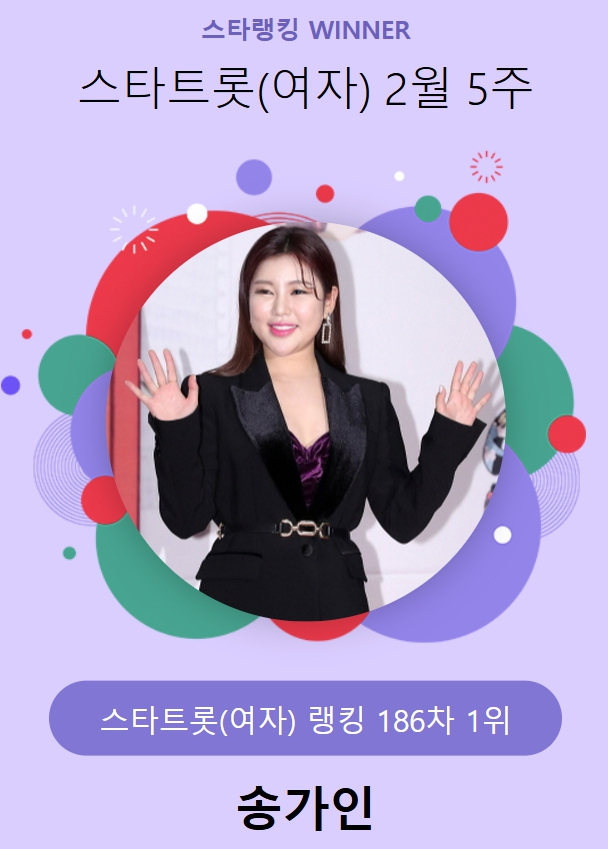 송가인은 지난달 27일 오후 3시 1분부터 6일 오후 3시까지 진행된 2월 5주(186차) 스타랭킹 스타트롯 여자 랭킹 투표에서 김태연, 김다현을 꺾고 1위를 차지했다.