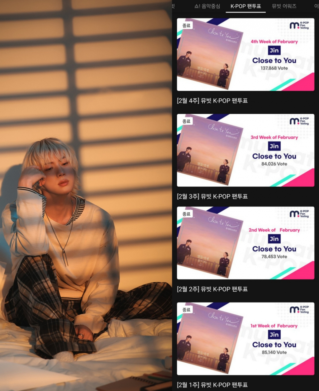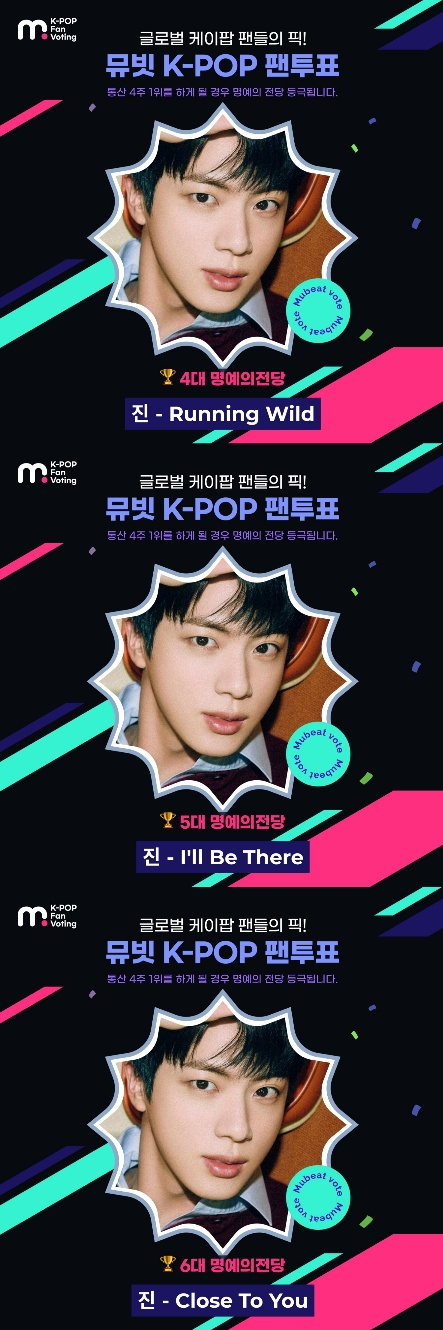 '뮤빗 K-POP 팬투표'에서 통산 4주 1위를 달성하면 명예의 전당에 등극한다. 진은 'Close to You'로 4주 연속 1위이라는 눈부신 기록을 달성하며 더욱더 강력한 팬덤 화력과 솔로 파워를 보여줬다.