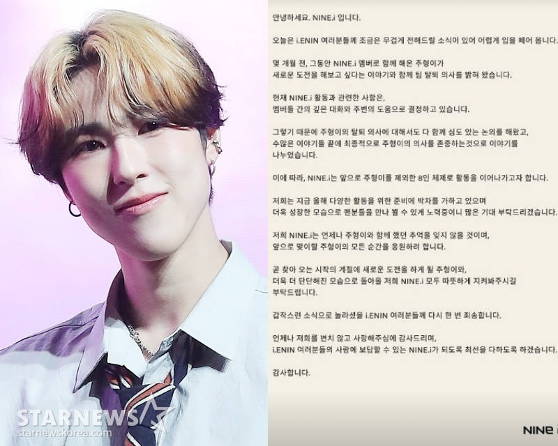 이날 나인아이 측은 "몇 개월 전, 그동안 나인아이 멤버로 함께해 온 주형이가 새로운 도전을 해보고 싶다는 이야기와 함께 팀 탈퇴 의사를 밝혀 왔다. 현재 나인아이 활동과 관련한 사항은 멤버들 간의 깊은 대화와 주변의 도움으로 결정하고 있다. 때문에 주형의 탈퇴 의사에 대해서도 다 함께 심도 있는 논의를 해왔고, 수많은 이야기 끝에 최종적으로 주형의 의사를 존중하는 것으로 이야기를 나눴다"라고 밝혔다.