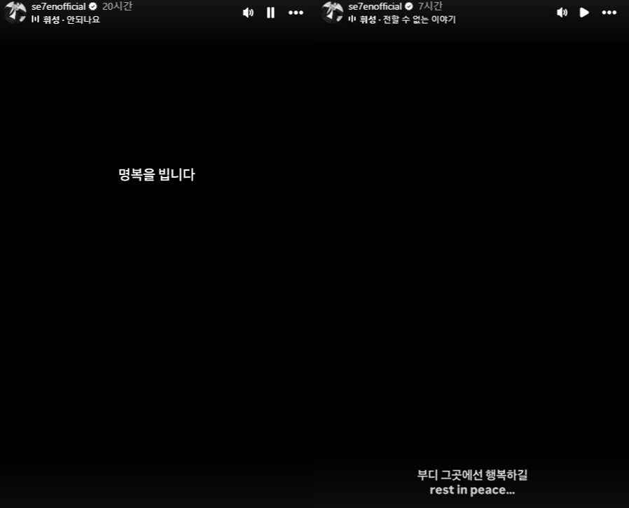 세븐은 12일 자신의 계정에 휘성의 '전할 수 없는 이야기'를 배경음악으로 설정하며 "부디 그곳에선 행복하길. rest in peace..."라고 글을 적었다. 그는 지난 11일에도 자신의 계정에 "명복을 빕니다"라는 글을 게재한 바 있다. 세븐은 과거 절친이었던 휘성을 이례적으로 이틀 연속 추모하는 모습을 보이며 비통함을 고스란히 전했다.