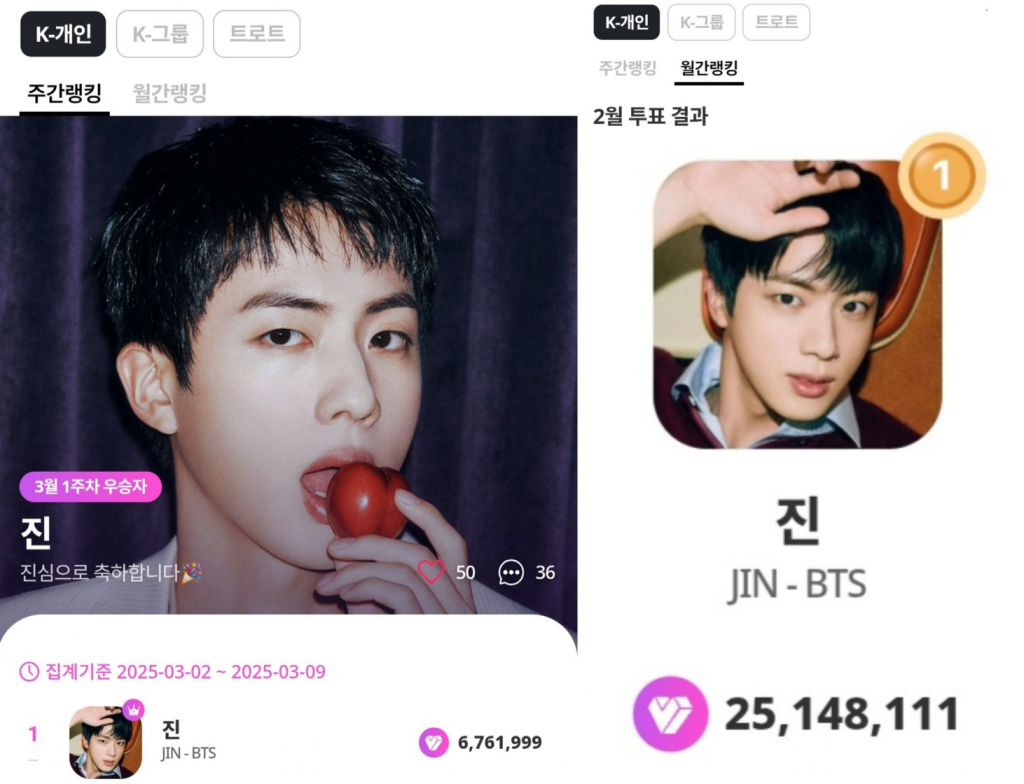 진은 마이원픽 'K-POP 개인 부문 주간랭킹' 3월 1주차(3월 2일~3월 9일) 투표에서 676만 1999개의 하트를 얻어 압도적인 표수로 1위에 올랐다.